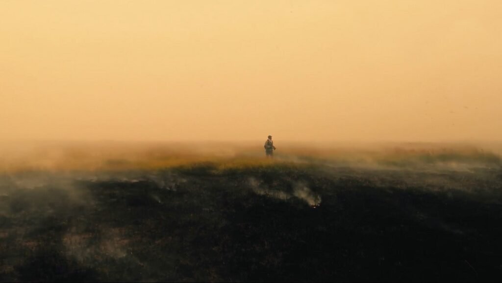 It’s a question that is, of course, unanswerable to any satisfying degree, but one which guides and pervades all of Abaturov’s observational, largely unstructured (in any conventional sense) Paradise, the query itself the closest we get to any kind of statement of intent. Everything is freighted with potential meaning. What of a government that places financial consideration above the lives of its citizens, particularly within this context where 80% of the regions affected by the enacted policy are dominated by ethnic minorities? What happens to a community’s collective psychology and identity when survival is a daily concern, life-and-death stakes rendered a mundanity? How does one’s notion of futurity reorganize itself around new realities? To the degree that Abaturov attempts any answers, he takes care to do so presentationally rather than discursively. Scenes of controlled burns, strategically felled trees, and planning sessions weave with those of wild horses kicking up dust on village streets, the glow of a tablet reflecting on a child’s face, and locals eating sandwiches on lunch breaks, flames licking at the edges of their carved-out, temporary haven. Masks are a common sighting in Paradise as well, the associated suggestions of 2021’s Covid-era living both thematic companion and refraction of the community’s looming fiery threat; iconography we’ve internalized over the 2020s is subtly and powerfully abstracted in its opaque inclusion here. But no scene or rhetorical throughline is over-enunciated or saddled with maudlin sentiment, the weight of the film’s images to be read in the accumulation of spaces between them.