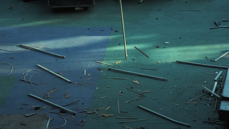 Marković has assembled the film into what appear to be “movements” of a sort; it begins with a series of shots that emphasize the lines of the interiors and how they cut through and across the frame. A lingering shot of closed blinds is juxtaposed with large, swooping cloth drapes that extend from floor to ceiling across glass panes. Another shot is simply dozens and dozens of desks stacked on top of one another, followed by a long close-up of what looks like elaborate rebar piping crisscrossing a ceiling. It’s all very quiet and carefully composed, as if these are all sculptural spaces containing found objects. Slowly, human figures appear, finally giving a sense of scale to the place. Now the film’s emphasis becomes the slow, repetitive nature of manual labor; hands scrape up tiling and carpet, while metal pipes and other debris are tossed down stairs into a pile. We see one young man take off his shoe and pick at a blister, before another person comes over and begins to assist him. Brief interstitial shots of old black-and-white photographs show the building when originally under construction, as well as a photo of a group of young workers. There’s a sort of historical narrative here, something about how the young bear the brunt of this sort of labor, as well as the march from Communism to neo-liberalism. It’s not progress necessarily, but an ongoing cycle of creation, destruction, and resurrection. What was once a monument to collective planning — the original building was heralded at the time for being completed in a record amount of time — is now a performance hall only for those wealthy enough to attend.