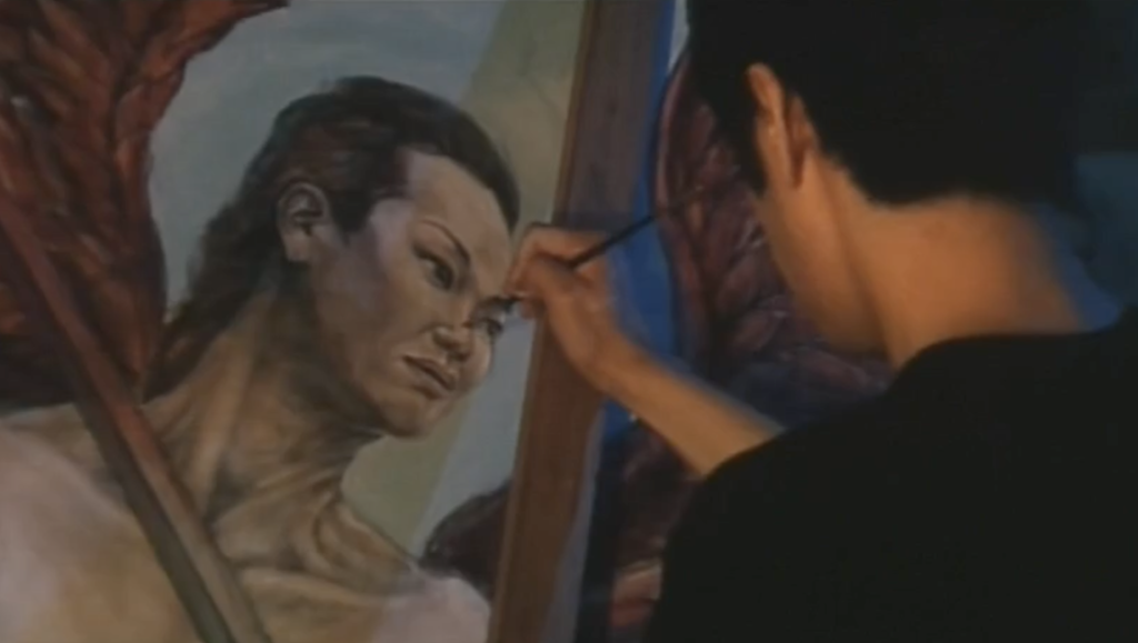 Takahashi’s film opens with Ryoko attending a kendo club practice that she attended during her time at art school. Does she still hold nostalgia for this past? For these moments and clashes of swords, she is human — unaware of her own body or power. Ryoko reunites with her junior, Hiroyuki Oshima (played by Hidetoshi Nishijima of Drive My Car), and is invited to his studio, soon learning that he holds a secret obsession for her — Hiroyuki paints nude images of Ryoko. He, for one, has not forgotten the past; rather, he has made erotic altars to it. Her image is burned into the surrounding canvas, and it seems she has entered a hell, or his chapel of paint, sweat, and flesh. Beautiful images summoned as horror. Beyond this mainstream, theatrical film, pink film held a similar obsession for art. Hisayasu Satō’s Uniform Virgin: The Prey (1986) featured an assault scene with paint, increasingly layered over a woman’s body like a Jackson Pollock painting. This would later be mirrored with Kazuhiro Sano’s painter character for Promiscuous Wife in Heat (1991). But when compared to those looser brushstrokes, Hiroyuki paints within the lines. He wants to not only capture Ryoko’s image, but also to define her. He cannot handle fluidity or ambiguity. Hiroyuki’s art has rules, long-studied from school and labored in obsession. He is initially unable to accept Ryoko’s complex gender reveal, and this resistance is similarly seen in the hostility he has for accepting his half-Japanese, half-Korean brother Tatsuo. To Hiroyuki, his brother is “failed Japanese.”