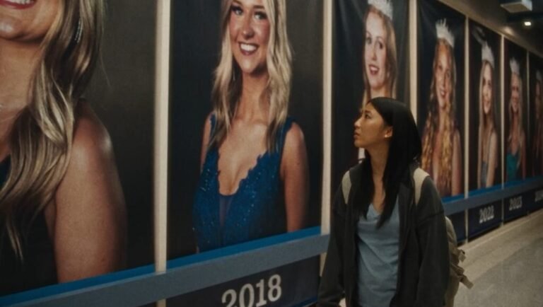 The latest in a recent trend of films that considers the Faustian trade-offs of junk science and pumping god knows what into your body in pursuit of the fleeting high of appearing beautiful — most famously The Substance, but also Max Minghella’s Shell — Slanted is less concerned with anti-aging and more so with internalized self-loathing as it applies to non-white people. In essence, the film treats being Caucasian as something aspirational; a societal cheat code no less desirable than being financially successful or famous. And Wang has quite a bit of fun presenting a skewed perspective on cultural whiteness, predominantly through the film’s art direction: the local coffee shop is called Freedom Beans, the most popular brand of beer is called ‘Merica Lite (and is advertised by buxom white women in bikinis), and even the nickname of the local high school is the Wizards, with the mascot appearing to be wearing a Klan robe. This is the world which Joan moves through and attempts to ingratiate herself to, even clinging to the quixotic dream of being voted prom queen as the ultimate form of acceptance.