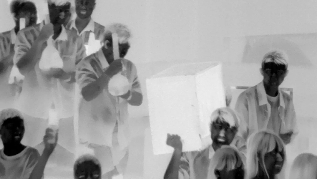 Once the film finally reaches the dancefloor, its camera switches to a thermal one, abandoning its rigid stasis for the freer movement of a handheld zoom that roams across the space. The inherent photonic specificity of the thermal optics, with its rough negative contrast, presents the dancers as a phantom, soulless throng moving in modest dance, while its focus stays with the very workers hyping sales. All this monitoring unfolds in dead silence, and the extended takes of several minutes imbue such scenes with ever-increasing disquiet. That is precisely the film’s strictly formalist and steadfastly devoted rhetorical stance: a leapfrog editing style that alternates between dancefloor and back-of-house, the latter dominating the runtime.
